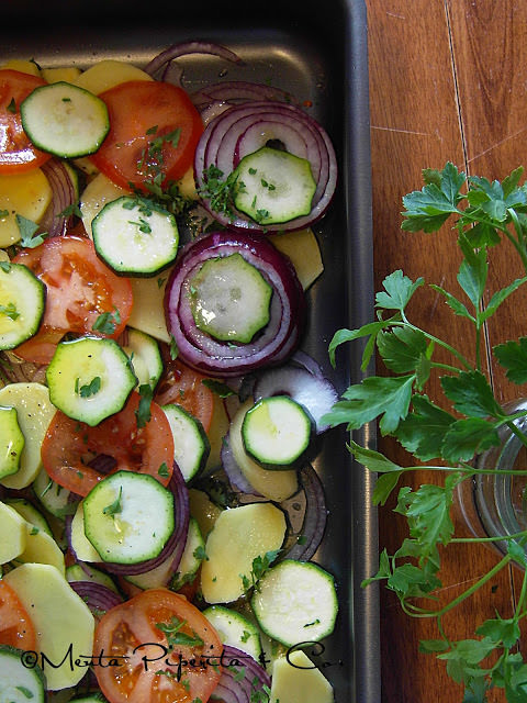 Prendete una teglia da forno ampia, versatevi un po’ d’olio d’oliva e iniziate a disporre le verdure a strati, come nell’immagine qui sotto: