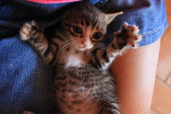 Mia madre, al sol sentire dell’esistenza di un gattino abbandonato nei pressi di casa, è letteralmente volata fuori dalla porta per tornare poco dopo, con in mano questo fagottino pulcioso. Pulcioso?! Non potete capire! Era così pieno di pulci e di uova da impiegarci almeno 10 giorni a pulirlo, insieme al veterinario. Peso lordo, comprensivo di parassiti: 200 g! Piccolo, esile, denutrito, con le orecchie grandi e gli occhietti spalancati…
