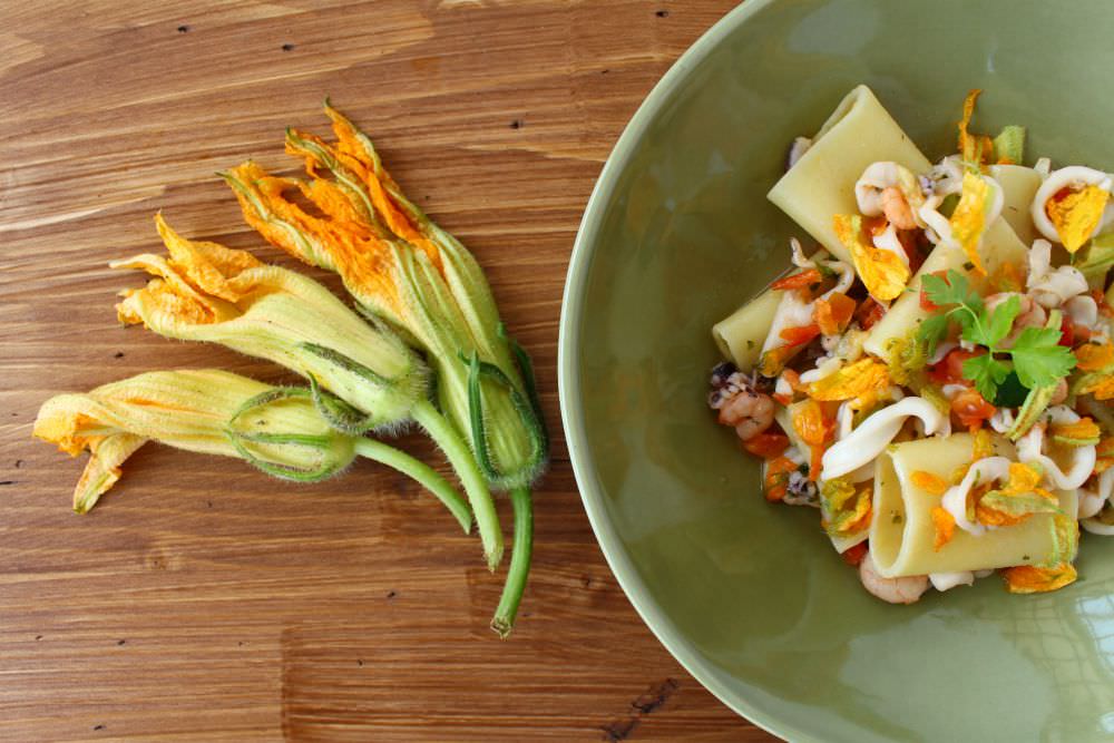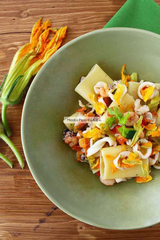 Cuocete i paccheri in abbondante acqua salata, scolateli e fateli soltare per un paio di minuti in padella con il sugo di verdure e pesce. Porzionate, decorando ciascun piatto con pezzetti di fiori di zucca e prezzemolo fresco.