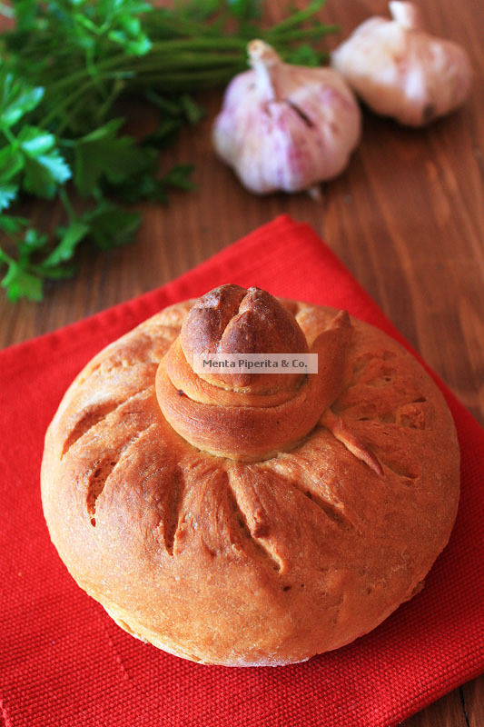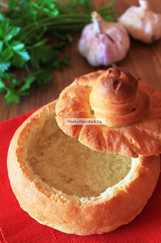 Ed in effetti questa simpatica pagnottella che assomiglia vagamente ad un bulbo d’aglio è un perfetto  “recipiente” per questa zuppa. Non siamo nuovi a creare zuppiere di pane, l’avevamo fatto anche qui in onore del 150° della Repubblica Italiana. In quel caso si trattava però di calotte di pane e non di pagnottelle vere e proprie, poi svuotate della mollica.