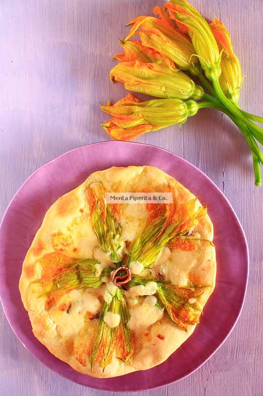 Pizza bianca con mozzarella, fiori di zucca e acciughe