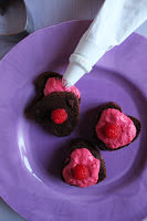 Prendi una torta al cioccolato già fatta, ad esempio la torta Pan di Stelle del Mulino Bianco – che, devo dire, tra tutte le torte pronte io trovo succulenta – ci ritagli dei bei cuoricioni e li dividi a metà per la farcia.