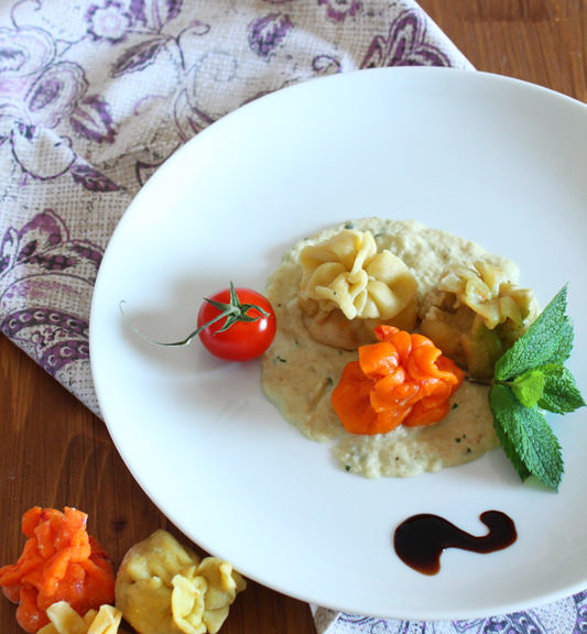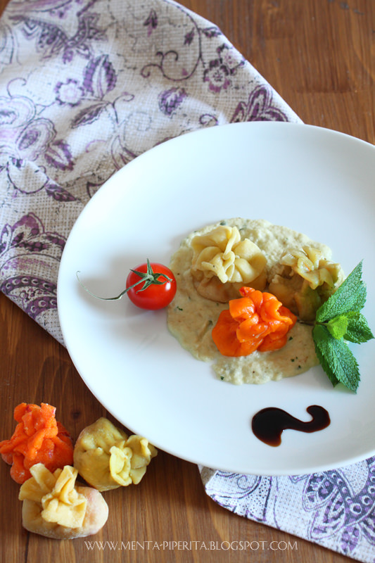 Il titolo di questa terza prova è: “Mamma, ho invitato a pranzo gli amici!” (frase che, vista la sua scarsa passione per i fornelli, ha sempre creato sudori freddi a mia madre quando ero io ad essere una teenager!) ed ecco che vi tiro fuori dal cappello magico dei fagottini tricolore (realizzati con pasta all’uovo semplice, pasta all’uovo con peperoni Peperlizia e pasta all’uovo con Carcioghiotto) farciti con fontina e pomodorini caramellati (ne sto andando davvero matta ultimamente e trovo che si sposino deliziosamente ai formaggi saporiti!), accomodati su una soffice mousse di melanzane e menta.