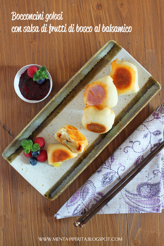 Sfornate i vostri bocconcini e accomodateli su un piatto di portata. Utilizzate la salsa ai frutti di bosco ormai fredda come intingolo, proprio come se si trattasse di un pezzetto di sushi intinto nella salsa di soia.