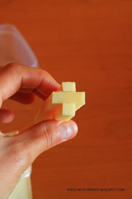 Nell’assicurarvi che il risultato è stato eccellente e che purtroppo i quadrotti sono già quasi finiti, lascio la parola alla ricetta. (Primo segreto: il taglio del formaggio, fate come vedete rappresentato nell’ immagine qui sotto, mi raccomando!).