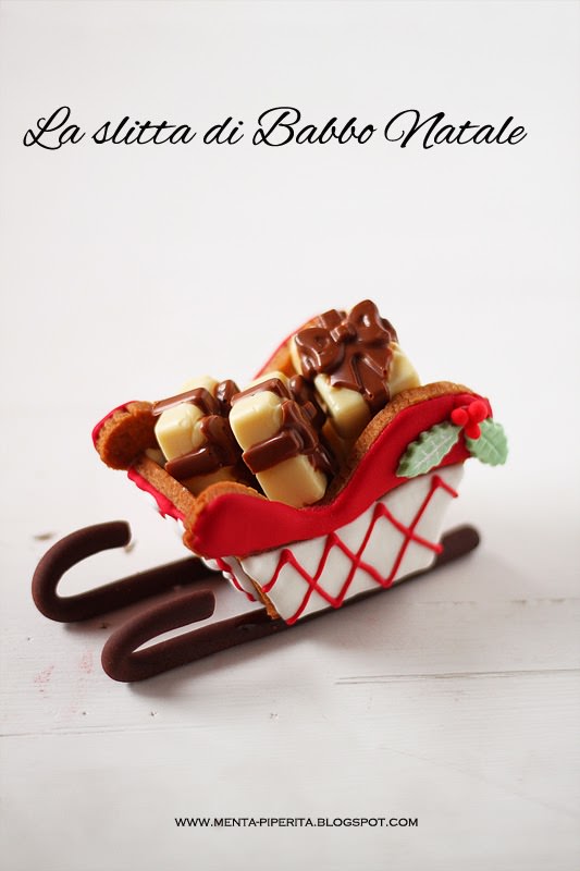 Decorate a piacere con ghiaccia magica – bianca e colorata – le varie parti della slitta e, una volta asciutte, assemblatele tra loro con ghiaccia magica bianca. Unitevi infine le lamine, utilizzando sempre un piccola quantità di ghiaccia magica. Riempite la slitta con i vostri “pacchi dono” e sistemate la slitta di Babbo Natale in cima alla vostra torta!