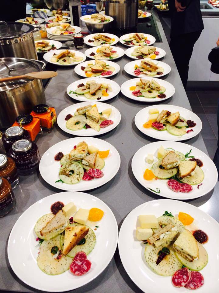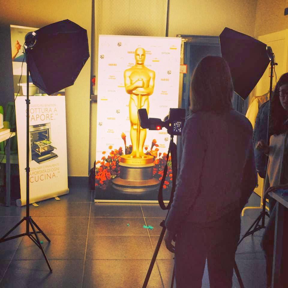 Affiancati da partner di eccezione (Epson Italia per la parte tecnologica e le proiezioni; Rigoni d’Asiago, Cascina San Cassiano, Haribo, Sartoria del Gusto, Perusini per la parte gastronomica, YouchefTv per riprese e fotografia), Elisa e Gualtiero hanno accolto noi ospiti in un ambiente raccolto, elegante e soffuso, con tavoli finemente apparecchiati. Alla pareti, le proiezioni di momenti emblematici della trascorsa notte degli Oscar con primi piani di attori e di attrici, e in fondo, opposta all’ingresso, lei, la statuetta tanto ambita, a grandezza naturale. Qui, imbracciando occhiali, boa di struzzo colorati, statuette, ciak e altri simpatici gadget ci siamo divertiti a farci scattar foto, come se ci trovassimo noi stessi sui rossi tappeti che guidano le star al Kodak Theater di Los Angeles durante la notte più attesa dell’anno.