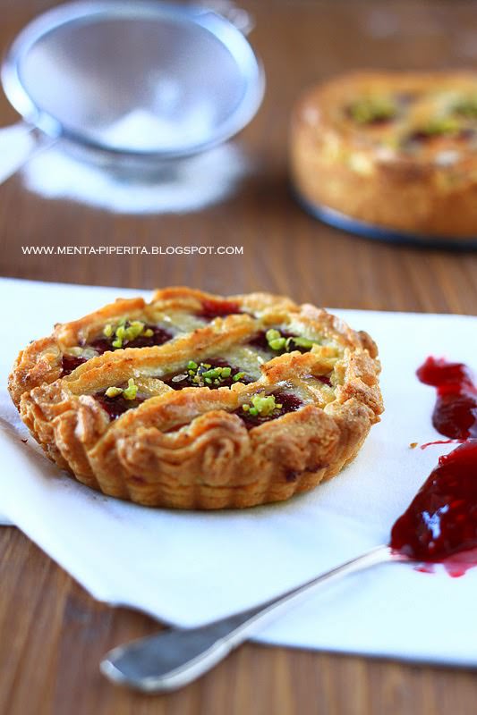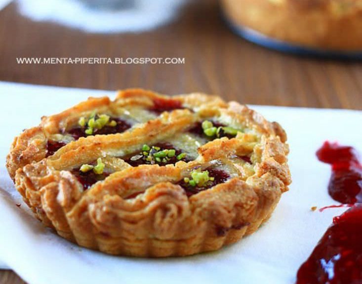 Infornate in forno già caldo a 180°pe 15/20 minuti. Estrate dal forno e fate raffreddare completamente prima di estrarre le crostatine dagli stampi. Rifinite poi con poca gelatina e con una spolverata di pistacchi tritati.