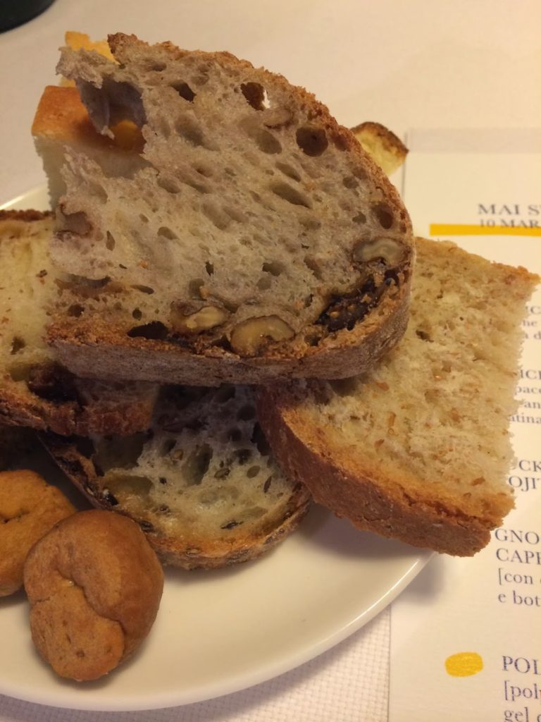 Ad accompagnare il nostro pasto, una gran varietà di pane rigorosamente fresco e preparato “in casa”: pane ai semi di lino, ai cereali, all’uvetta, fichi e noci…E poi ancora taralli e focaccia. Come a dire, ce n’è per tutti i gusti.