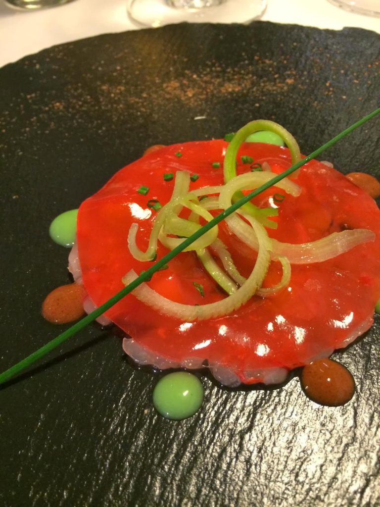 A seguire, la creativa ceviche: un carpaccio di gamberi accompagnati da cipollotti di Tropea, sedano croccante, maionese di corallo, salsa di lime e un’originalissima quanto perfetta gelatina al Campari. Una portata piena di personalità in cui il dolce del gambero viene perfettamente bilanciato dall’amaro del Campari. A rendere ancor più interessante il tutto, un ricercato impiattamento su elegantissimi piatti di ardesia.