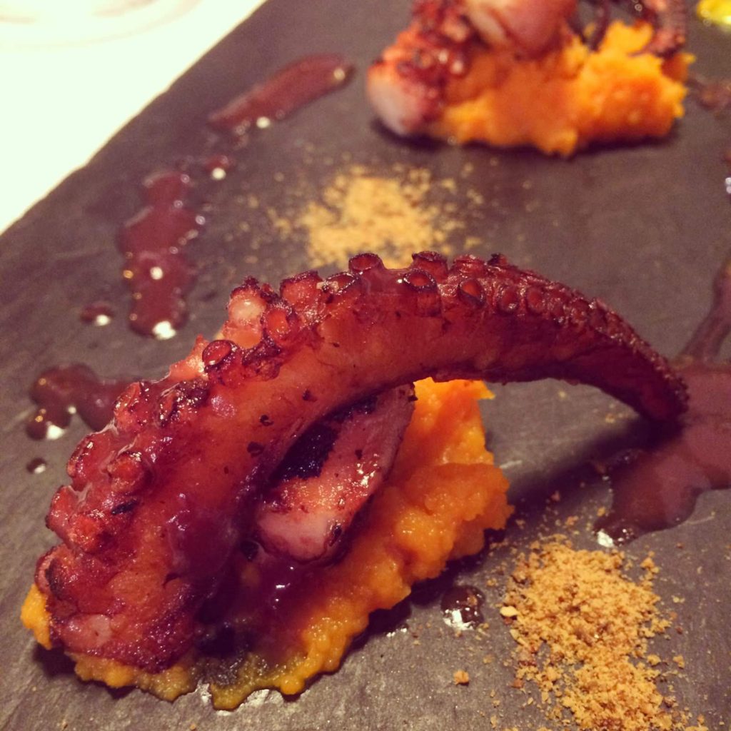 Sul secondo siamo tutti unanimi. Al tavolo vengono serviti, come da nostra ordinazione, per la maggior parte porzioni di polpo abbrustolito con purea di patata americana, gel di arancio e polvere di patate. Il piatto è un’autentico spettacolo. Appaga tanto l’occhio con una presentazione d’eccellenza, quanto il gusto. Il polpo è cotto alla perfezione, morbido all’interno e leggermente croccante all’esterno. La purea di patata americana, con la sua naturale dolcezza, si sposa perfettamente al sentore di arancia regalandoci un’esperienza di gusto che ci fa trovare concordi nel sostenere di essere di fronte ad uno dei piatti migliori della serata.