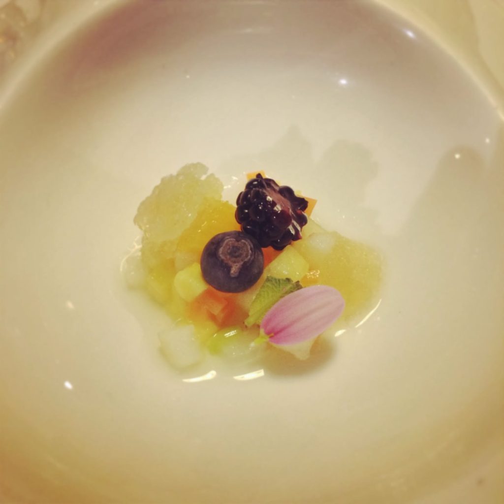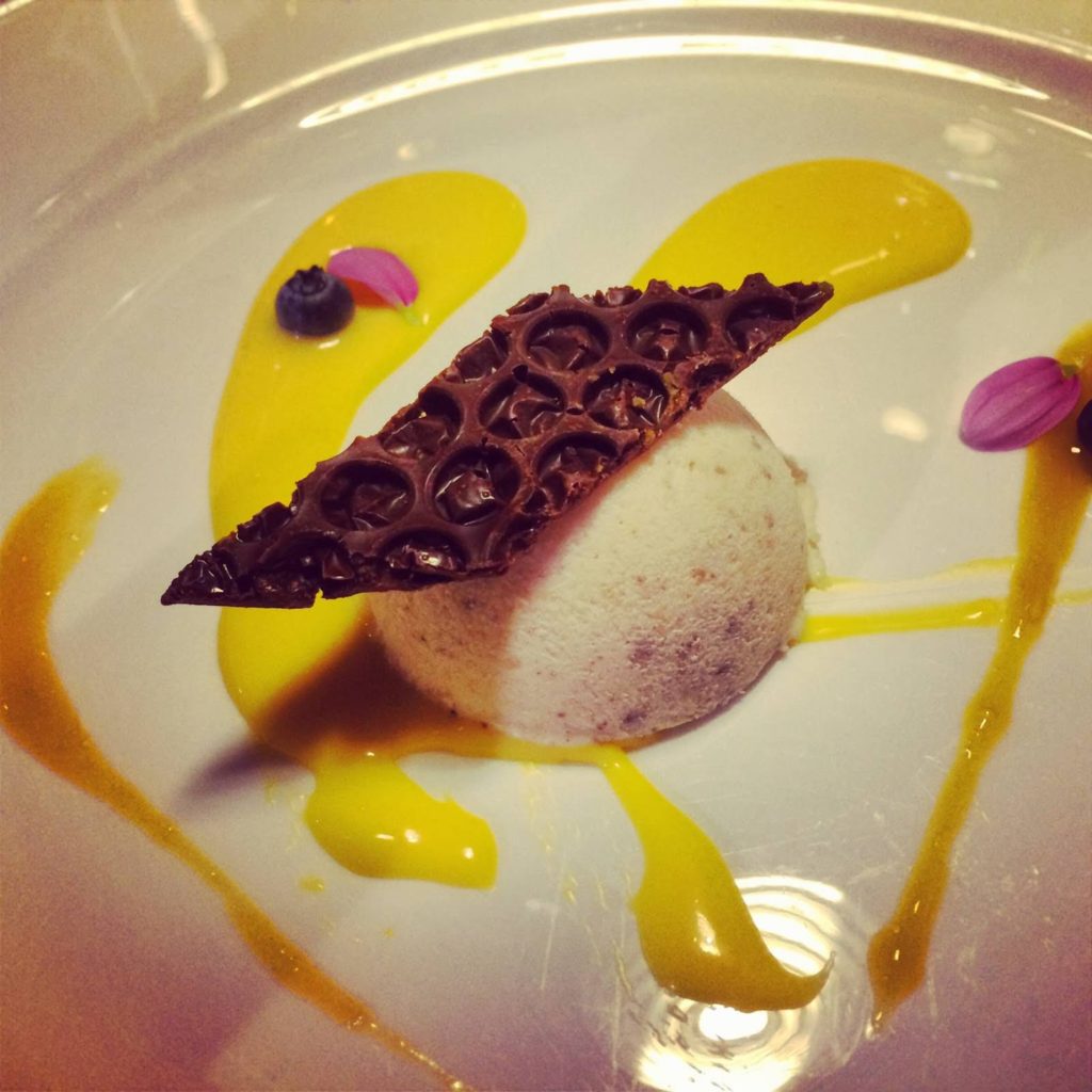 La macedonia di frutta e ortaggi con erbe aromatiche e granita di tisana detox è un grazioso giardino di colore e di sapore. Una coccola confortevole e rilassante, che apre il campo al dessert, un parfait al torrone con cremoso al cioccolato bianco e salsa di frutto della passione.